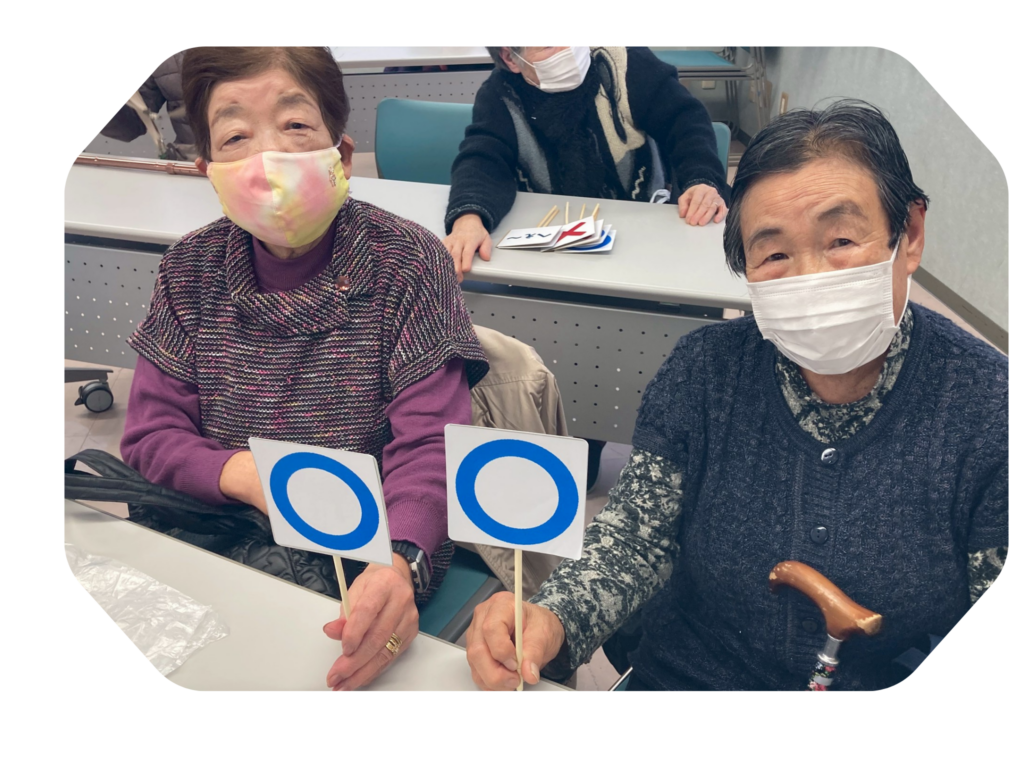 その後、「○」「×」「へぇ~」の3つの札を持っていただき、おくすりクイズをしました。「くすりは緑茶で飲んでもよい。丸かバツか!?」など、改めてくすりのことについて考えてもらうクイズです。みなさん「丸!」「バツだと思う!」など悩みながらクイズに参加してくれました。クイズの答えの解説を薬剤師がする度に「へぇ~」の札をあげてもらい、新たな発見もしていただけたようでした。
