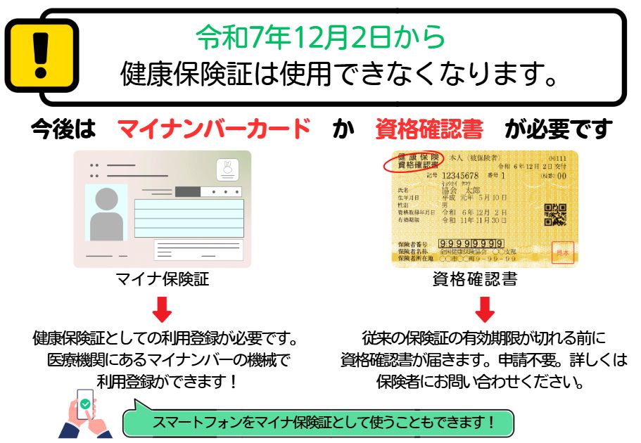 現在テレビCMも流されていますが、いよいよ12月1日で従来の保険証は使えなくなります。12月2日以降のご利用についてお知らせします。